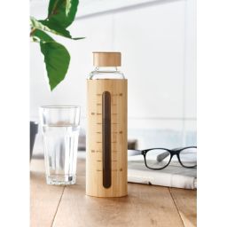 Bottiglia in vetro borosilicato con rivestimento e tappo in bambù e dettaglio di misurazione. Capacità: 600 ml.