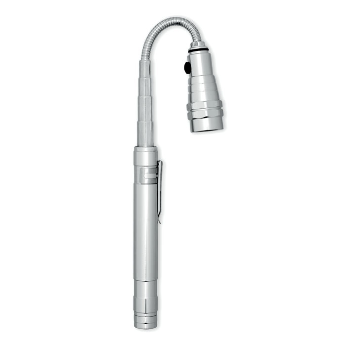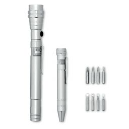 Set in alluminio con torcia estendibile con 3 luci LED e cacciaviti a forma di penna. 4 batterie LR44 incluse. Presentato in scatolina.